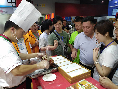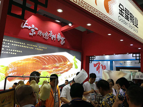 本次展會(huì)公司不僅帶去了自主培育的烤炙型北京鴨制作的鴨坯進(jìn)行展示,還安排專業(yè)烤鴨師現(xiàn)場(chǎng)烤炙,讓參會(huì)嘉賓近距離觀看正宗北京烤鴨的制作流程,品嘗到北京烤鴨的“本味”。這期間,廣州老字號(hào)餐飲店陶陶居的總廚師長(zhǎng)也對(duì)金星烤鴨連連稱贊。