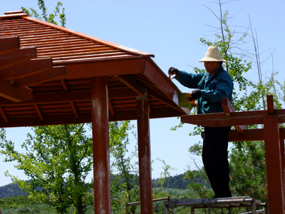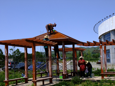 ? ? ? ? 在辦公樓旁涼亭內(nèi)小憩,頓覺神清氣爽,涼亭自此便成為員工駐足納涼的必備之處。隨著時(shí)間的推移,涼亭外表的油漆經(jīng)過風(fēng)吹日曬日漸褪色,木料結(jié)合處縫隙也逐漸變大破損。為了讓員工在每日勞累的工作之余得以舒緩身心,在公司領(lǐng)導(dǎo)的支持下,后勤部人員主動(dòng)承擔(dān)起對(duì)涼亭的修繕工作。