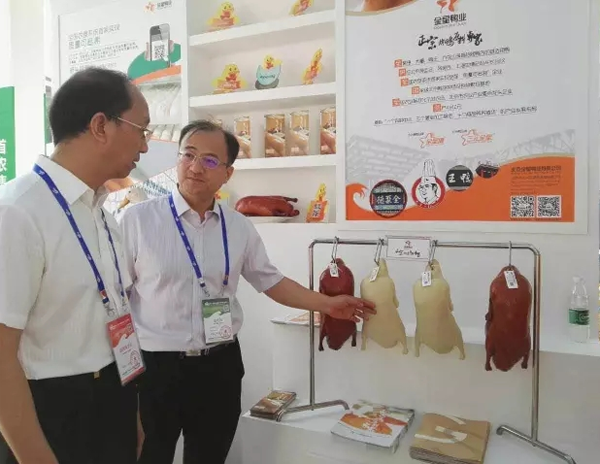 首農(nóng)集團董事、首農(nóng)股份董事長尹彥勛在金星鴨業(yè)總經(jīng)理王凱的陪同下蒞臨北京鴨展位參觀并指導工作。